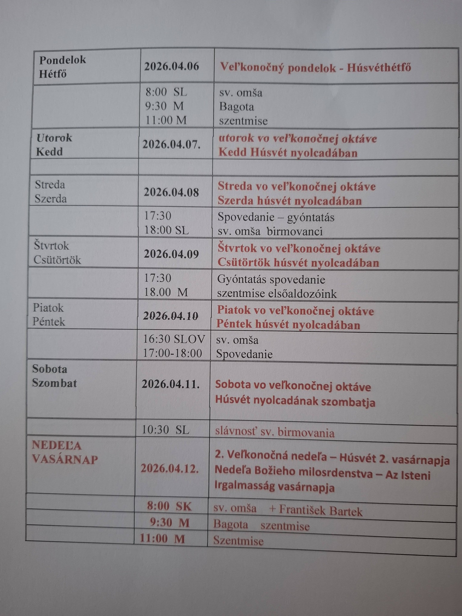 Oznamy po 1. veľkonočnej nedeli